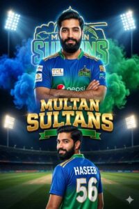 Enter your tUse the face from the uploaded image and keep the facial identity 100% accurate. Ignore the pose, outfit, background, camera angle, and lighting from the uploaded photo. Extract ONLY the face and place it into the following premium Multan Sultans poster: 1. TOP MAIN PORTRAIT (ULTRA PREMIUM LOOK) A chest-up portrait of the person in a confident sports-star pose. Arms crossed, strong posture, slight smile. Wearing the 2026 Multan Sultans–style jersey: Deep royal blue as the base color Emerald green side panels and accents Gold detailing on shoulders and collar Official sponsor patches in white, gold, and blue Highly detailed jersey texture: stitching, fabric shine, shadow depth. Cinematic rim-light on shoulders for a glowing effect. 2. SECOND POSE (BOTTOM BACK-VIEW) Same person from the back. Turning the head slightly towards the camera with a confident smile. Back of jersey must show: White bold number: 56 White uppercase name: HASEEB Gold outlines around the number for a premium look Jersey folds, lighting, and shadows must be photorealistic. 3. OFFICIAL MULTAN SULTANS COLORS Use the official color palette only: Royal blue (#0057A6) Emerald green (#008E4F) Gold (#E4B646) White accents All lighting, smoke, and glow must match these exact tones. 4. SMOKE & ENERGY EFFECTS (NEXT-LEVEL QUALITY) Dense dual-tone royal-blue and emerald-green smoke behind the top player. Smoke must glow softly as if lit by stadium floodlights. Use layered, cinematic fog like professional PSL posters. No random colors — smoke must match jersey tones perfectly. 5. BACKGROUND (FULL PREMIUM STADIUM SCENE) Dark nighttime cricket stadium backdrop. Bright white and gold floodlights shining from corners. Slight atmospheric haze for realism. Stadium seating, boundary rope, and pitch visible but subtly blurred. Gradient sky with deep navy tones. 6. TEXT & POSTER LAYOUT (MUST MATCH EXACT STYLE) Add bold, powerful text between both players: MULTAN SULTANS in giant gold letters Use the exact PSL-style kingly font Strong metallic texture Soft inner glow and outline Slight 3D depth effect Below text: Small ribbon-style plate in green or gold. Place the Multan Sultans logo emblem behind the top portrait, slightly transparent and glowing. 7. LIGHTING & FINISH High-contrast sports lighting Clean bright highlights across face and jersey Smooth cinematic shadows HDR-quality clarity Vibrant colors with PSL poster polish No cartoonish or over-edited look — must stay photorealistic Ultra-sharp edges, premium commercial quality 8. RULES FOR THE AI Use only the face from the uploaded photo. Do NOT copy hair, pose, clothing, or background from the upload. Build the entire poster layout EXACTLY as described. Two clear poses: top-front + bottom-back. Keep everything consistent with Multan Sultans branding.ext here…