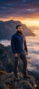 Create a 100% realistic cinematic photo of this person standing on a mountain cliff above the clouds at sunrise. The person should be full body visible from head to toe and standing confidently near the edge, looking at the horizon.