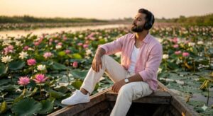 The Setting: He is sitting relaxed on the edge of a wooden boat. The river is a sea of vibrant pink and white lotus flowers.