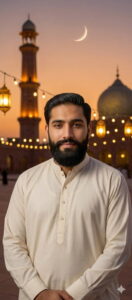Mosque-style background (blurred slightly to keep focus on the person)
